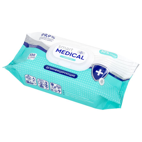 Дезинфицирующие салфетки спиртовые 100 штук SMART MEDICAL, крышка-клапан, 72029