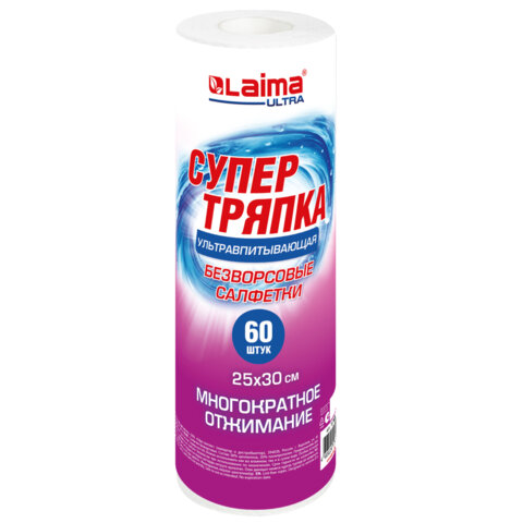 Салфетки БЕЗВОРСОВЫЕ 60 штук, 25х30 см, СУПЕРВПИТЫВАЮЩИЕ многоразовые, ЦЕЛЛЮЛОЗНЫЕ, LAIMA ULTRA, 700990