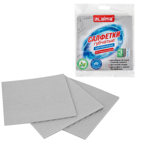 Салфетки губчатые для уборки кухни 15х15 см, ЦЕЛЛЮЛОЗНЫЕ, КОМПЛЕКТ 3 шт., серые, LAIMA, 700261