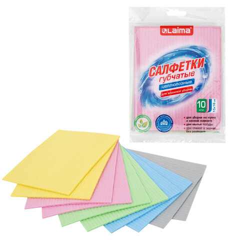 Салфетки губчатые для уборки кухни 15х18 см, ЦЕЛЛЮЛОЗНЫЕ, КОМПЛЕКТ 10 шт., цветные, LAIMA, 700269