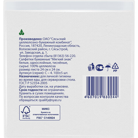 Салфетки бумажные, 100 шт., 24х24 см, МЯГКИЙ ЗНАК, белые, 100% целлюлоза, C4