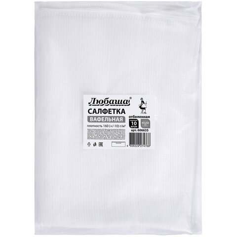 Салфетки ВАФЕЛЬНЫЕ отбеленные, 45х60 см, плотность 160(±10) г/м2, КОМПЛЕКТ 10 шт., ЛЮБАША, 606635