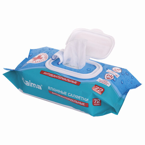 Салфетки влажные 72 шт., АНТИБАКТЕРИАЛЬНЫЕ с пластиковым клапаном, LAIMA "Antibacterial", 129997