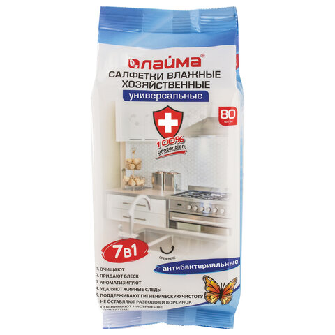 Салфетки влажные хозяйственные LAIMA "УНИВЕРСАЛЬНЫЕ "7 в 1", антибактериальные, 80 шт., 605659