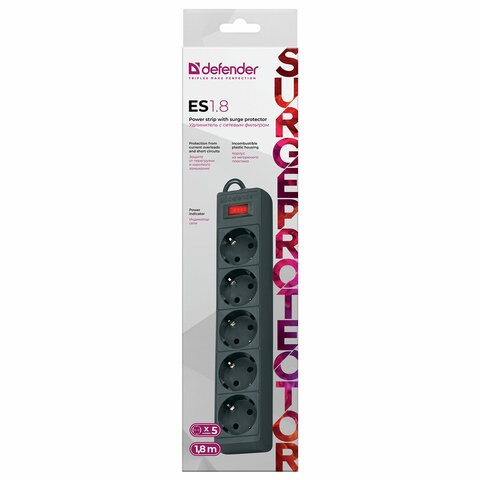 Сетевой фильтр DEFENDER ES, 5 розеток, 1,8 м, черный, 99484