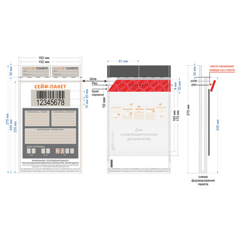 Сейф-пакеты изготовлены из непрозрачного, влагонепроницаемого материала, исключающего возможность просмотра вложений и воздействия окружающей среды. Предназначен для пересылки и транспортировки ценных бумаг, договоров, денег и драгоценных металлов.