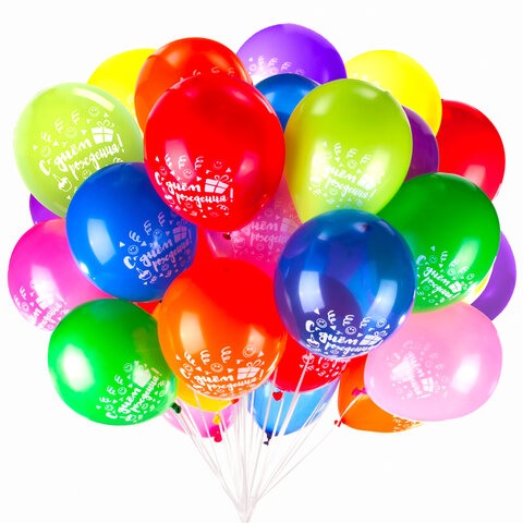 Шары воздушные ЗОЛОТАЯ СКАЗКА, 12" (30 см), КОМПЛЕКТ 50 штук, ассорти 10 цветов, с рисунком "C днем рождения", пакет, 105005