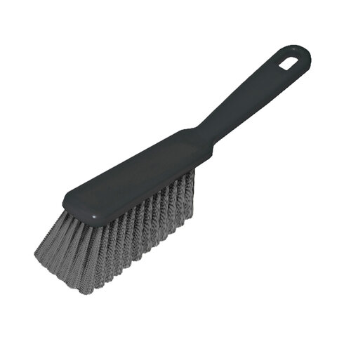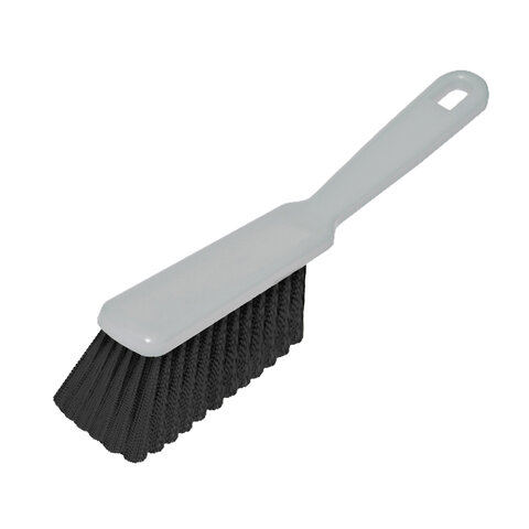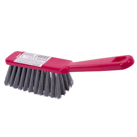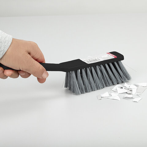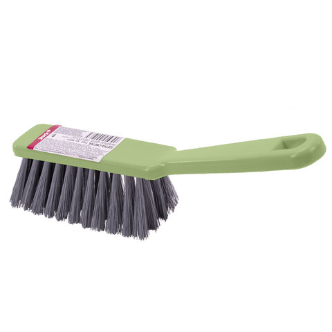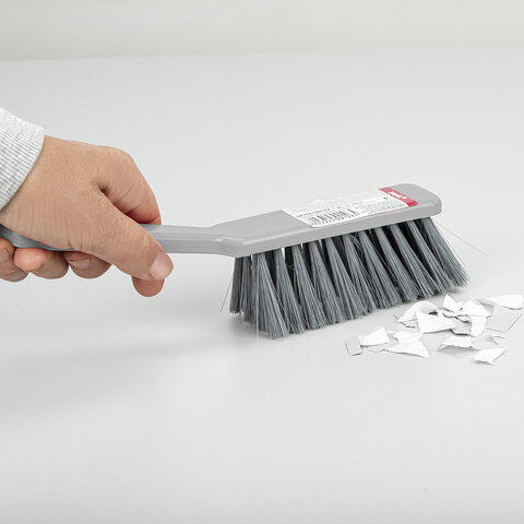 Щетина набита под углом, позволяющим захватить максимальную поверхность. Очень удобная ручка. Щетка имеет отверстие для крючка. Прекрасно подходит к совку этого же типа.