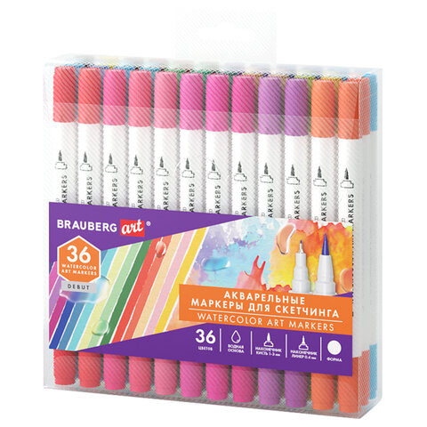 Маркеры акварельные для скетчинга двусторонние (кисть и линер) 36 цветов, BRAUBERG ART, 152666