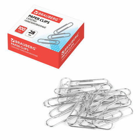 Скрепки BRAUBERG, 28 мм, никелированные, 100 шт., в картонной коробке, Россия, 221523