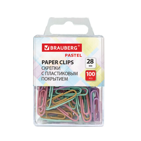 Скрепки BRAUBERG PASTEL, 28 мм, пастельные цвета, 100 шт., в пластиковой коробке, 271956