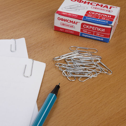 Скрепки ОФИСМАГ, 28 мм, оцинкованные, 100 шт., в картонной коробке, 227582