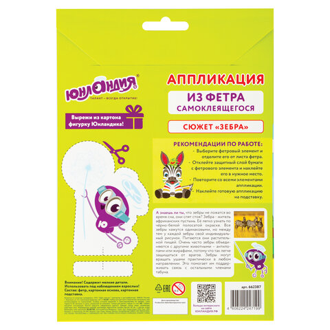 Аппликация из фетра ЮНЛАНДИЯ "Зебра" - это весёлый и занимательный способ развития мелкой моторики, аккуратности и фантазии ребёнка. Все элементы в составе самоклеящиеся, для работы не требуются ножницы и клей.