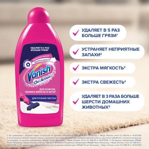 Шампунь VANISH "3 в 1" для ручной чистки ковров и обивки мебели. Шампунь глубоко проникает в волокна ковра, высвобождая частички грязи и выталкивая их на поверхность. Активный кислород в составе формулы позволяет удалить въевшиеся пятна.
