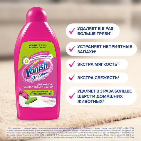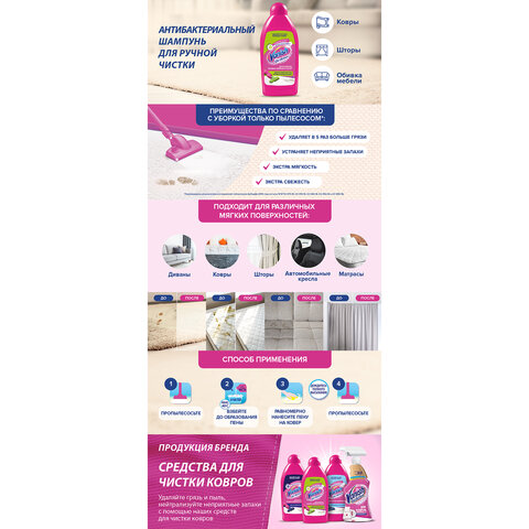 Формула VANISH "Антибактериальный" сочетает технологию глубокого проникновения внутрь ковра, растворения и удаления въевшейся пыли и грязи и специальные компоненты, убивающие болезнетворные микробы на 99,9%