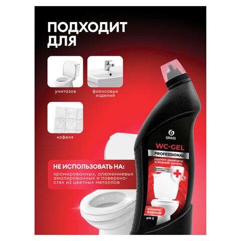 Кислотное чистящее средство GRASS WC-GEL PROFESSIONAL для чистки унитазов, фаянсовых изделий, кафеля от известкового налета, потеков ржавчины, солевых отложений.