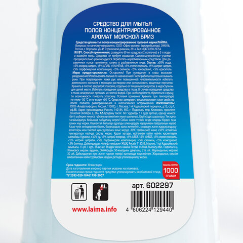 Средство для мытья пола 1 кг, LAIMA PROFESSIONAL концентрат, "Морской бриз", 602297