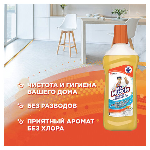 Средство для уборки дома МИСТЕР МУСКУЛ "Цитрусовый коктейль" подходит для очищения и дезинфекции напольных покрытий, включая плитку, ламинат, линолеум, пластик и керамогранит, а также плинтусов, раковин и других поверхностей. Нет хлора в составе.