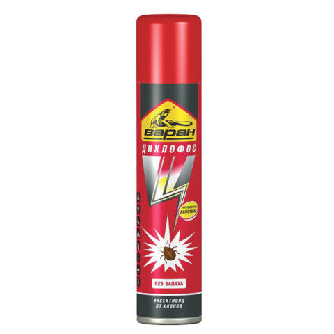 Средство инсектицидное ДИХЛОФОС "Варан" предназначено для эффективного уничтожения нелетающих (клопы, тараканы, блохи, муравьи, кожееды) и летающих (мухи, комары, москиты, бабочки моли) насекомых в помещениях.