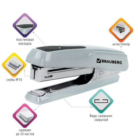 Степлер №10 BRAUBERG "Extra", до 20 листов, антистеплер, серый, 229083