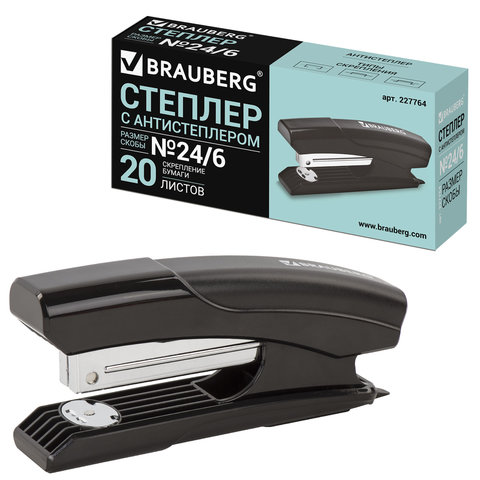 Степлер №24/6, 26/6 BRAUBERG "Black Jack", до 20 листов, антистеплер, черный, 227764