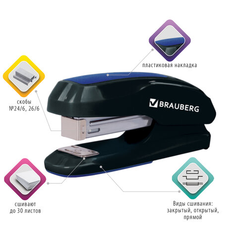Степлер №24/6, 26/6 BRAUBERG "Extra", до 30 листов, черно-синий, 229084