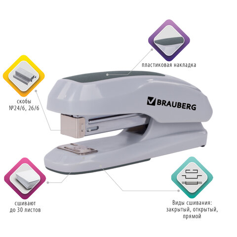 Степлер №24/6, 26/6 BRAUBERG "Extra", до 30 листов, серый, 229089