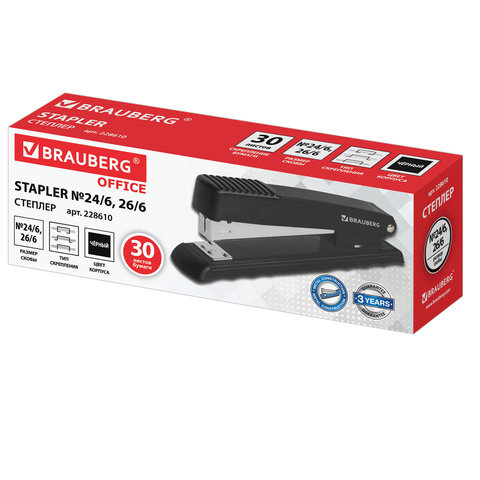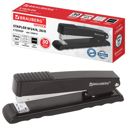 Степлер №24/6, 26/6 металлический BRAUBERG "Office", до 30 листов, полнозагрузочный, черный, 228610