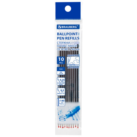 Стержни шариковые масляные BRAUBERG "WRITING 3.0", мягкое письмо, 140 мм, КОМПЛЕКТ 10 ШТ., СИНИЕ, игольчатый узел 0,5 мм, 170414