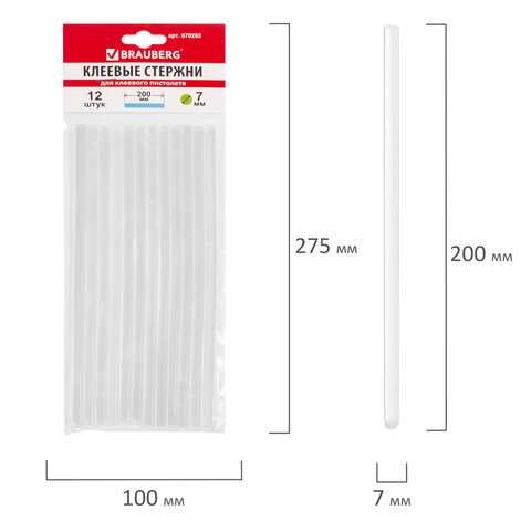 Клеевые стержни, диаметр 7 мм, длина 200 мм, прозрачные, комплект 12 шт., BRAUBERG, европодвес, 670292
