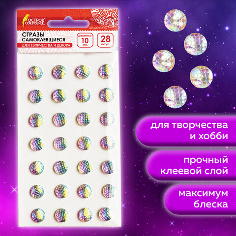 Стразы самоклеящиеся КРУГЛЫЕ, 10 мм, 28 штук, с радужным эффектом, на подложке, ОСТРОВ СОКРОВИЩ, 662232
