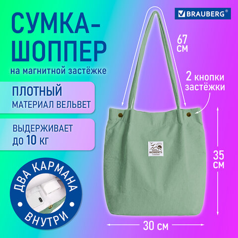 Сумка шоппер BRAUBERG MOMENTS, вельвет, 35х30 см, мятный, 271908