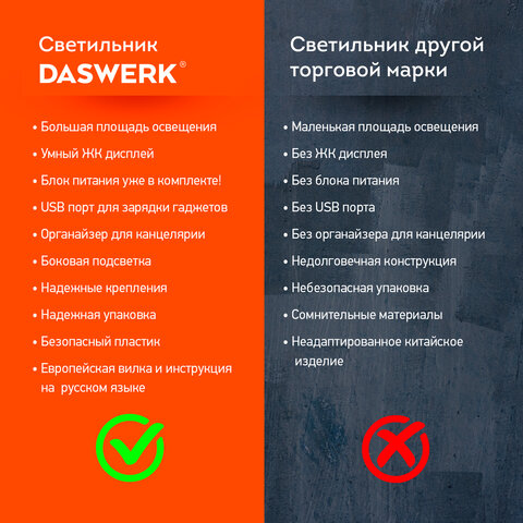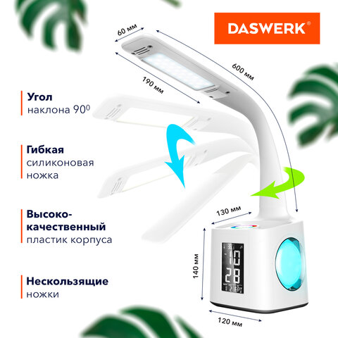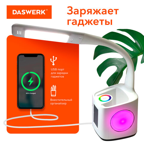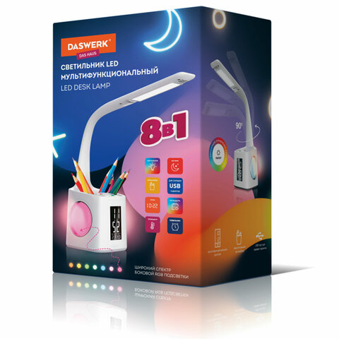 Многофункциональный светильник DASWERK является незаменимым атрибутом рабочего места. Светильник оборудован ЖК-дисплеем, органайзером для канцелярии, USB-разъемом для зарядки гаджетов, RGB-подсветкой. Отличный вариант для школьника и студента.