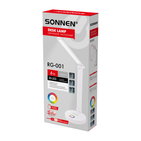 Настольная лампа-светильник, ночник SONNEN RG-001, 30 LED, 6 Вт, 3 режима, RGB-подсветка, белый, 238774