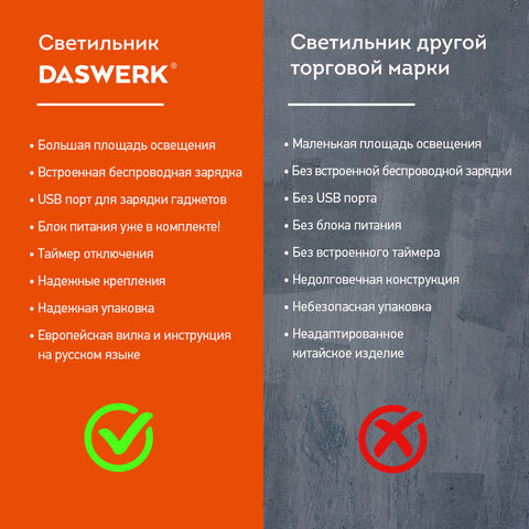 Многофункциональный светильник DASWERK является незаменимым атрибутом рабочего места. Светильник оборудован дополнительными функциями: беспроводной зарядкой и таймером отключения. Прекрасно подойдет для школьника, студента, офисного менеджера.