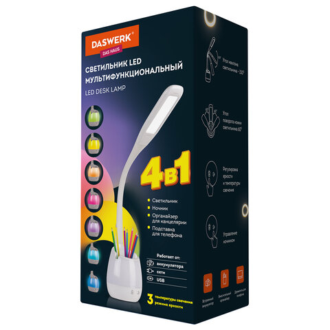 Многофункциональный светильник DASWERK является незаменимым атрибутом рабочего места. Светильник оборудован органайзером для канцелярии, USB-разъемом для зарядки гаджетов, RGB-подсветкой. Отличный вариант для школьника и студента.
