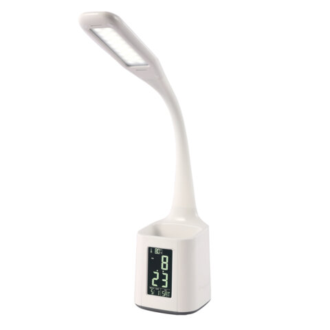 Настольная лампа-светильник является незаменимым атрибутом рабочего места. Модель SONNEN HS-01 прекрасно подойдет для школьника, студента и офисного сотрудника. Данный светильник оборудован дополнительными функциями: календарь, часы, термометр, будильник.
