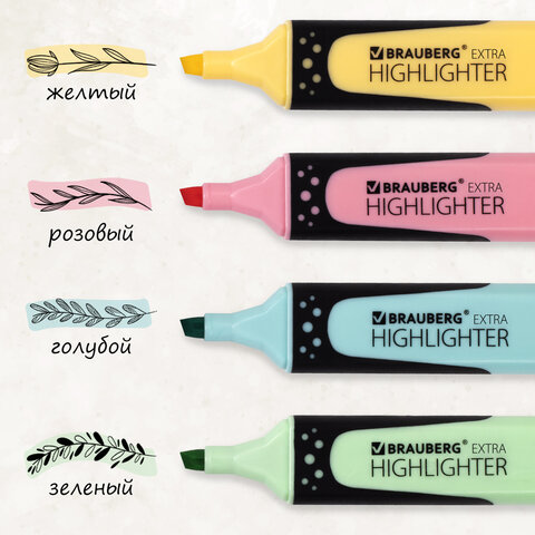 Набор текстовыделителей BRAUBERG 4 шт., АССОРТИ, "EXTRA PASTEL", прорезиненный корпус, линия 1-5 мм, 151756