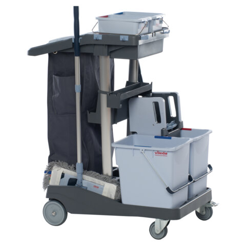 Комплексная тележка ВолеоПро с вертикальным отжимом. Компактная и маневренная. Позволяет комфортно убирать небольшие территории и легко помещается в стандартный лифт.