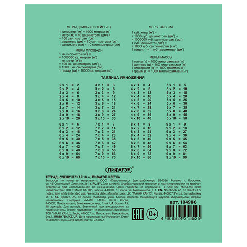 Тетрадь ПИФАГОР с классической зеленой обложкой подойдет для занятий школьнику преимущественно начальных и средних классов. На обороте представлена дополнительная информация.