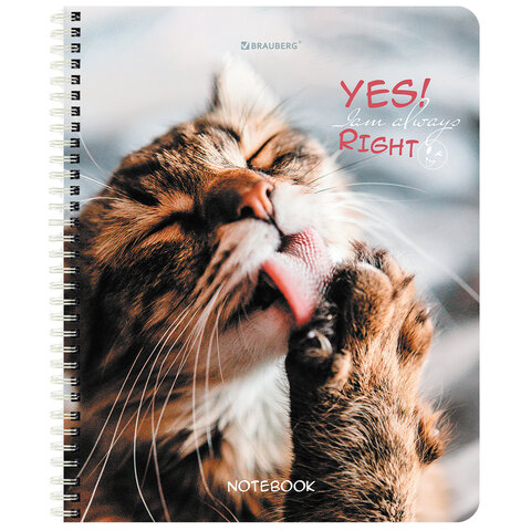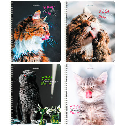 Тетрадь А5 80 л. BRAUBERG, гребень, клетка, глянцевая ламинация, "Довольные Коты" (микс в спайке), 404417