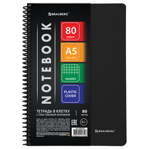 Тетрадь обложка пластик, А5, 80 л., спираль пластик, клетка, BRAUBERG "Metropolis", черный, 404745