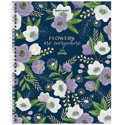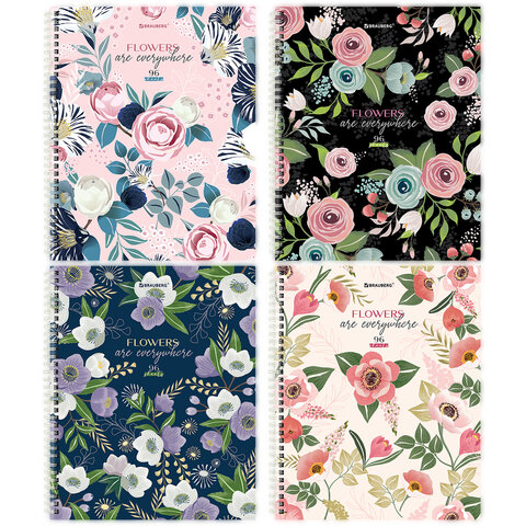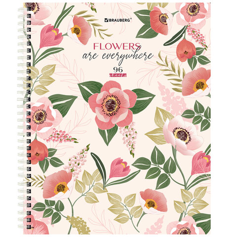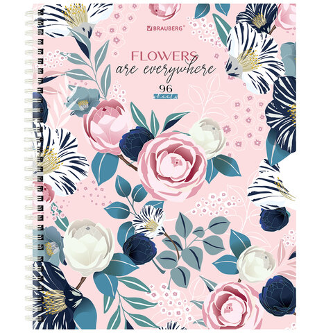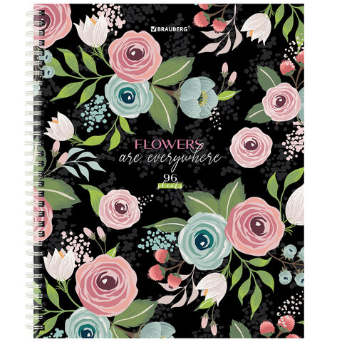 Тетрадь А5 96 л. BRAUBERG, гребень, клетка, твёрдая обложка, "Flowers" (микс в спайке), 404444