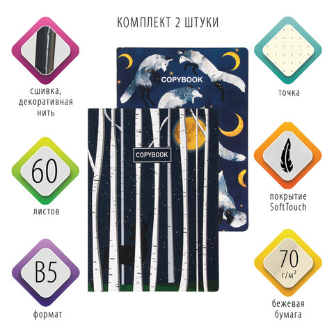 Тетради 60 л. в точку обложка SoftTouch, НАБОР 2 шт., бежевая бумага 70 г/м2, сшивка, B5 (179х250 мм), НОЧЬ, BRAUBERG, 403829