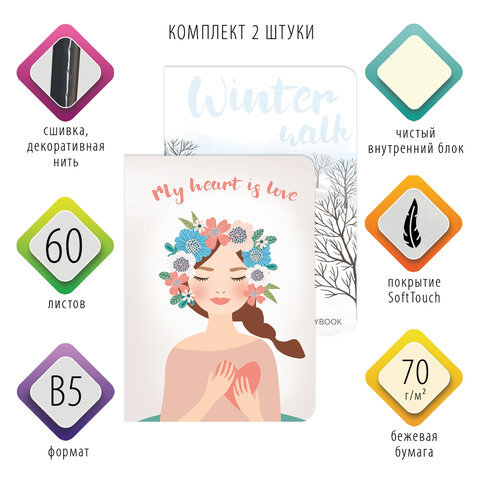 Тетради-скетчбуки 60 л. обложка SoftTouch, НАБОР 2 шт., бежевая бумага 70 г/м2, сшивка, B5 (179х250 мм), ROMANTIC, BRAUBERG, 403832