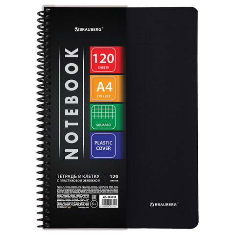 Тетрадь обложка пластик, А4, 120 л., спираль пластик, клетка, BRAUBERG "Metropolis", черный, 404740