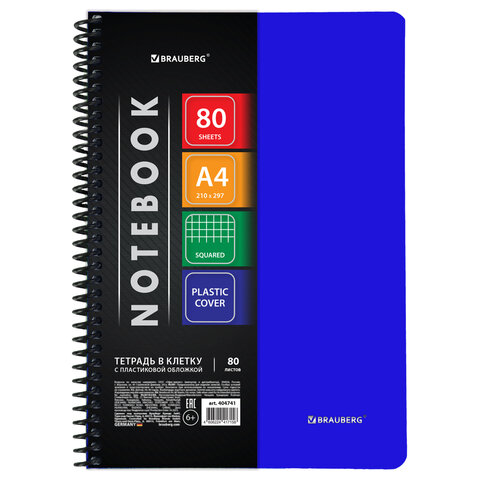 Тетрадь обложка пластик, А4, 80 л., спираль пластик, клетка, BRAUBERG "Metropolis", синий, 404741