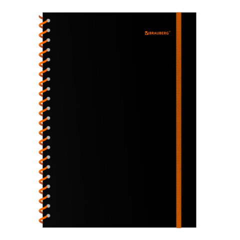 Тетрадь обложка пластик, А4 80 л., спираль пластик, резинка, клетка, BRAUBERG, черный/оранжевый, 405382