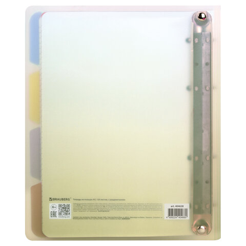 Тетрадь на кольцах А5 175х220 мм, 120 л., пластик, с разделителями, BRAUBERG, Желтый, 404628