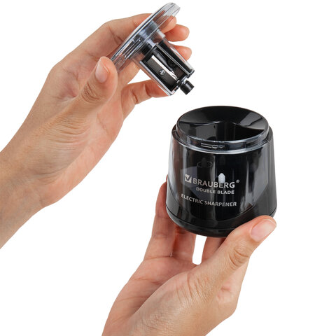 Электрическая точилка BRAUBERG DOUBLE BLADE BLACK с контейнером для сбора стружки и прямым двойным лезвием, работает от 2 батареек АА (в комплект не входят). Предназначена для затачивания деревянных и пластиковых карандашей диаметром 6-8 мм.
